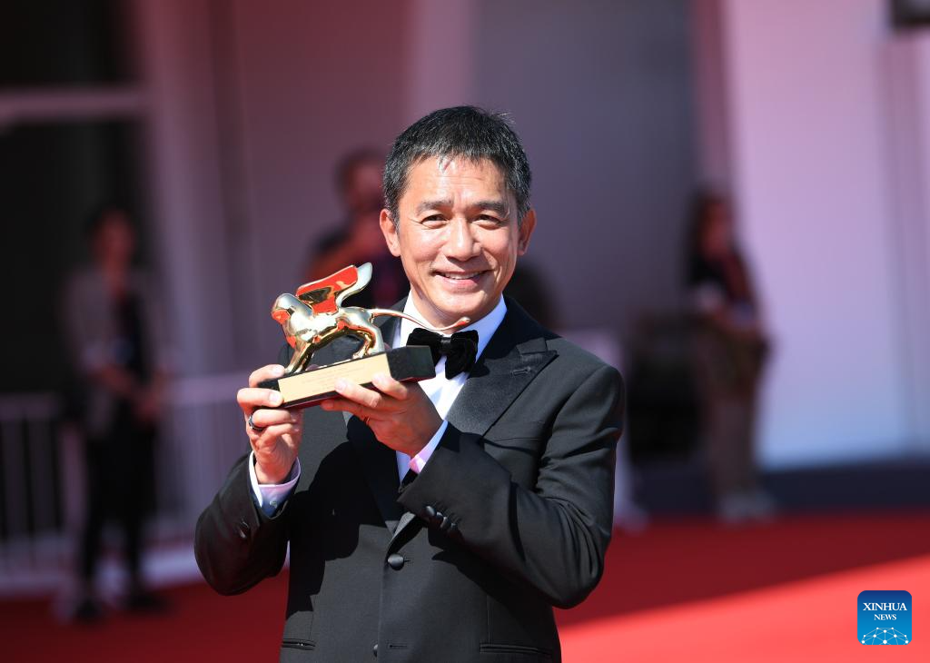 Actor Tony Leung Chiu-Wai poses with his trophy at an award ceremony during the 80th Venice International Film Festival in Venice, Italy, on Sept. 2, 2023. Tony Leung Chiu-Wai of Hong Kong, China was presented with the Golden Lion for Lifetime Achievement during the event on Saturday. (Xinhua/Jin Mamengni)