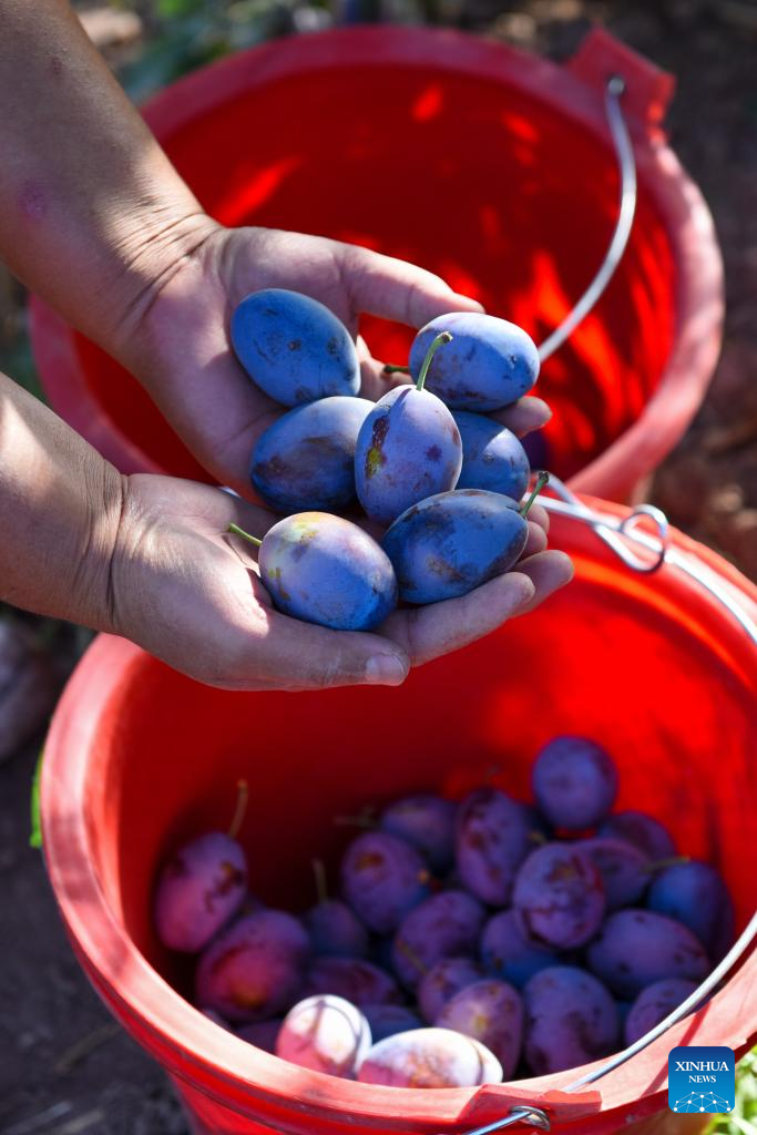 This photo taken on Aug. 4, 2023 shows freshly-picked plums at an orchard in Payzawat County, Kashgar, northwest China's Xinjiang Uygur Autonomous Region. (Xinhua/Ding Lei)