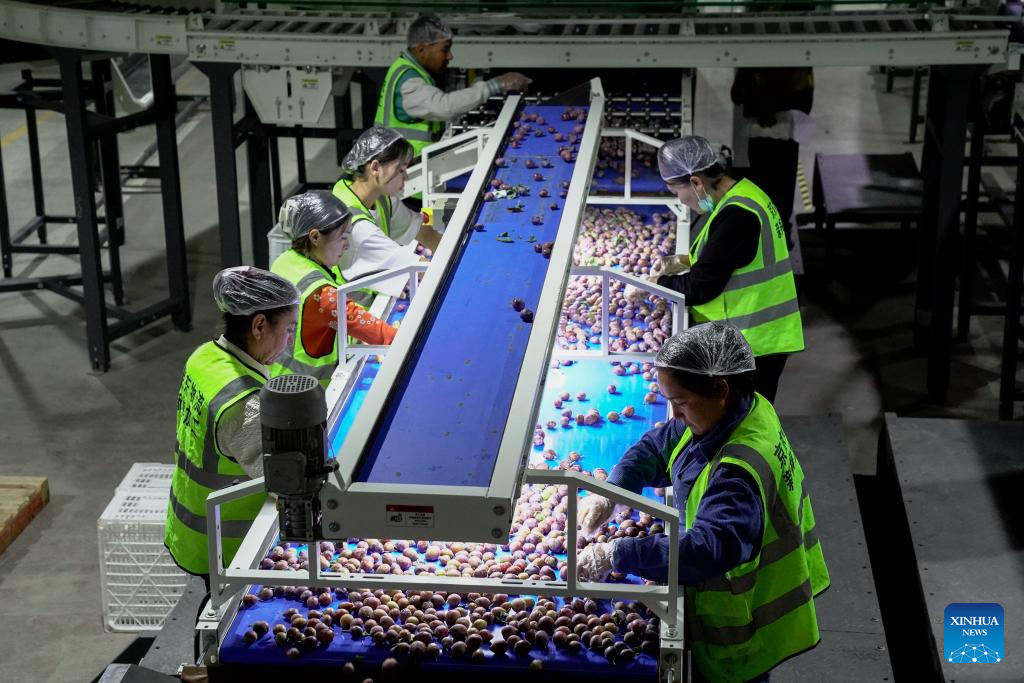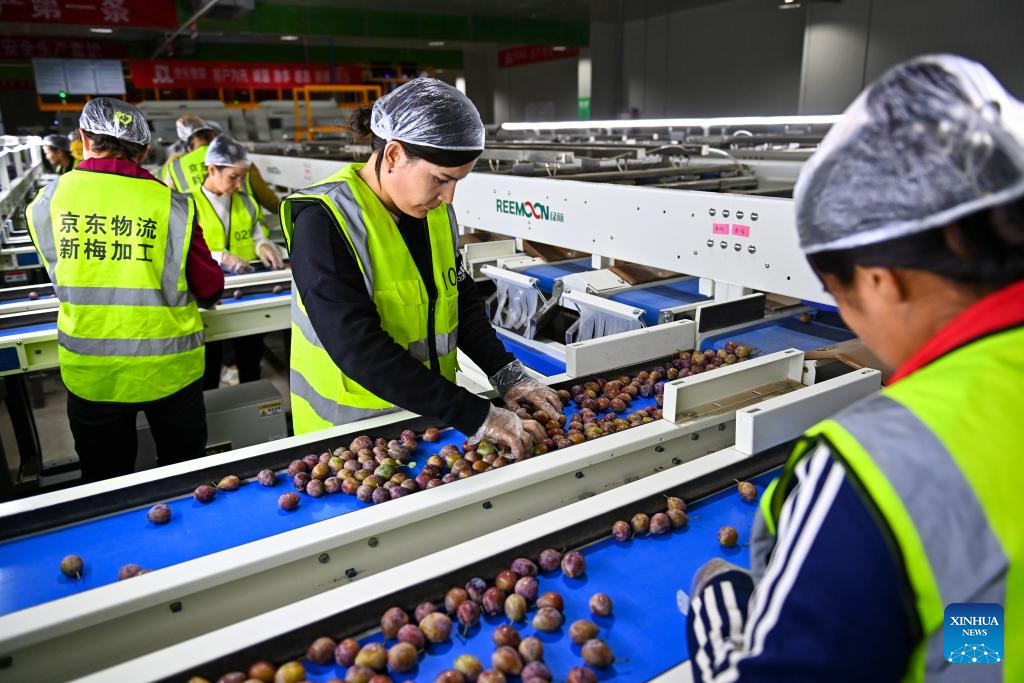 This photo taken on Aug. 30, 2023 shows workers sorting out plums on a smart operating line at a plum industry park in Payzawat County, Kashgar, northwest China's Xinjiang Uygur Autonomous Region. Plum cultivation industry has become a major driver for local economy in Payzawat County. (Xinhua/Ding Lei)