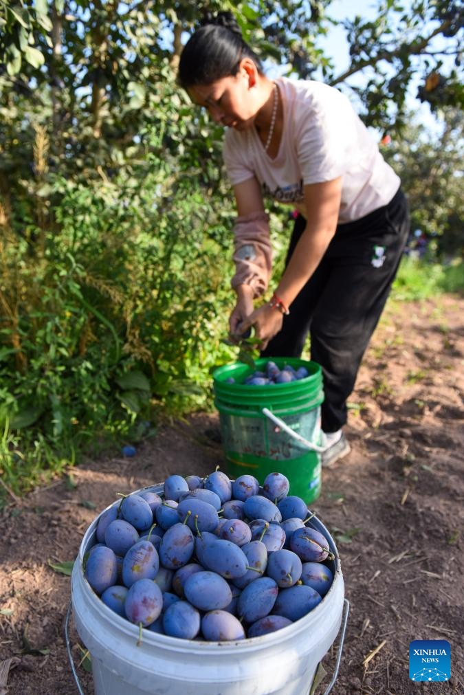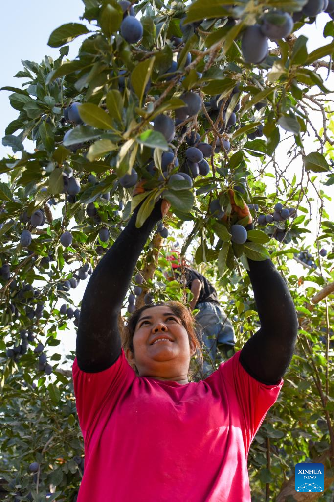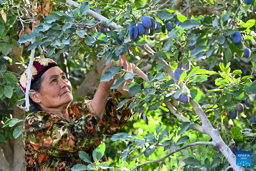 This photo taken on Aug. 4, 2023 shows villagers picking plums at an orchard in Payzawat County, Kashgar, northwest China's Xinjiang Uygur Autonomous Region. (Xinhua/Ding Lei)