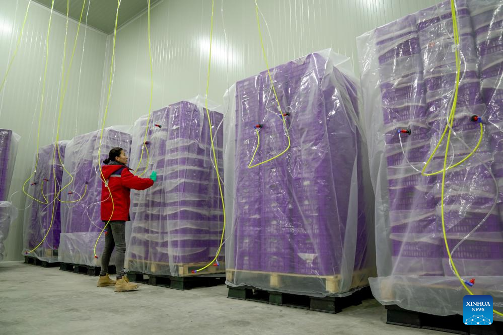 This photo taken on Sept. 2, 2023 shows a worker checking on stored plums at a plum industry park in Payzawat County, Kashgar, northwest China's Xinjiang Uygur Autonomous Region. (Xinhua/Ding Lei)