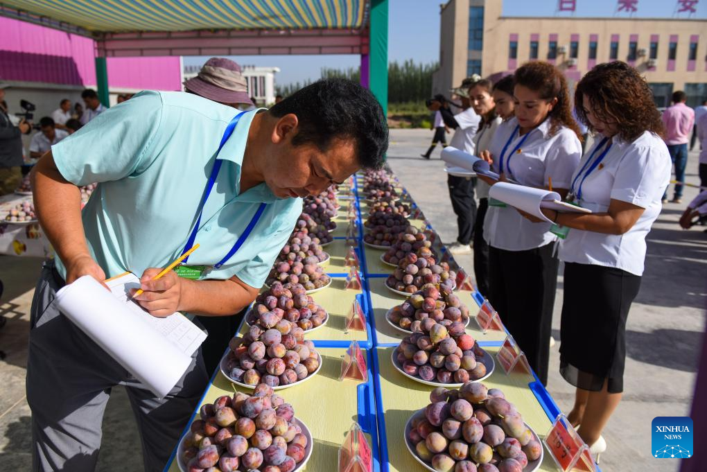 This photo taken on Aug. 4, 2023 shows judges marking plums at a trade fair held in a plum industry park of Payzawat County, Kashgar, northwest China's Xinjiang Uygur Autonomous Region. (Xinhua/Ding Lei)