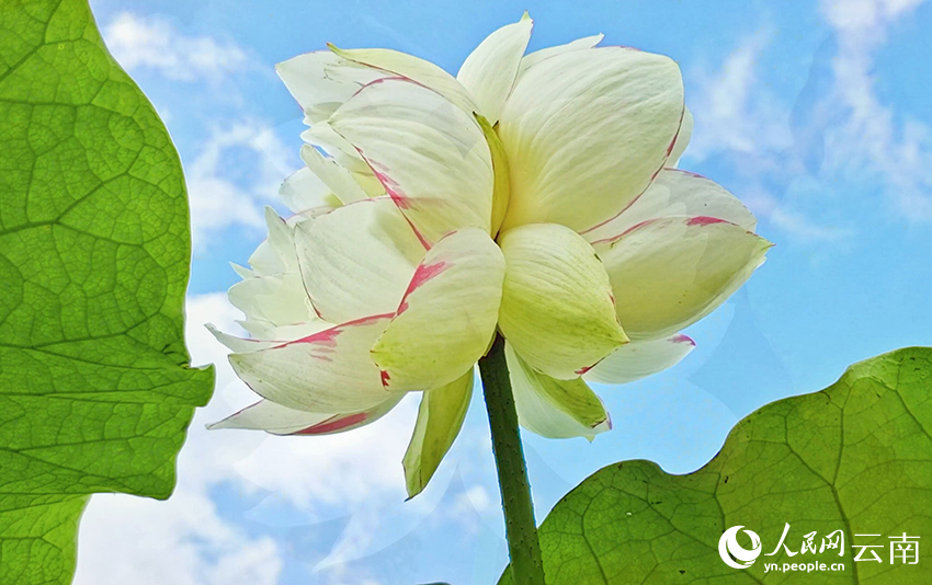 Versicolor lotus flowers have white blooms with purple-red margins. The margins of small versicolor lotus flowers are more delicate than that of lotus flowers of "Dasajin," a variety also known as large versicolor lotus flower. Versicolor lotus planting dates back hundreds of years in Puzhehei.
