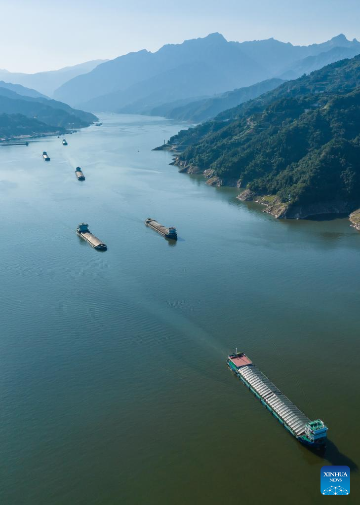 This aerial photo taken on Sept. 4, 2023 shows ships sailing at the Zigui Harbor in Zigui County of Yichang, central China's Hubei Province. The monthly cargo throughput via the five-tier ship locks at the Three Gorges Dam, the world's largest hydropower project in the upper stream of the Yangtze, reached a record high of over 15.71 million tonnes in August, according to the China Three Gorges Corporation. (Photo by Zheng Jiayu/Xinhua)