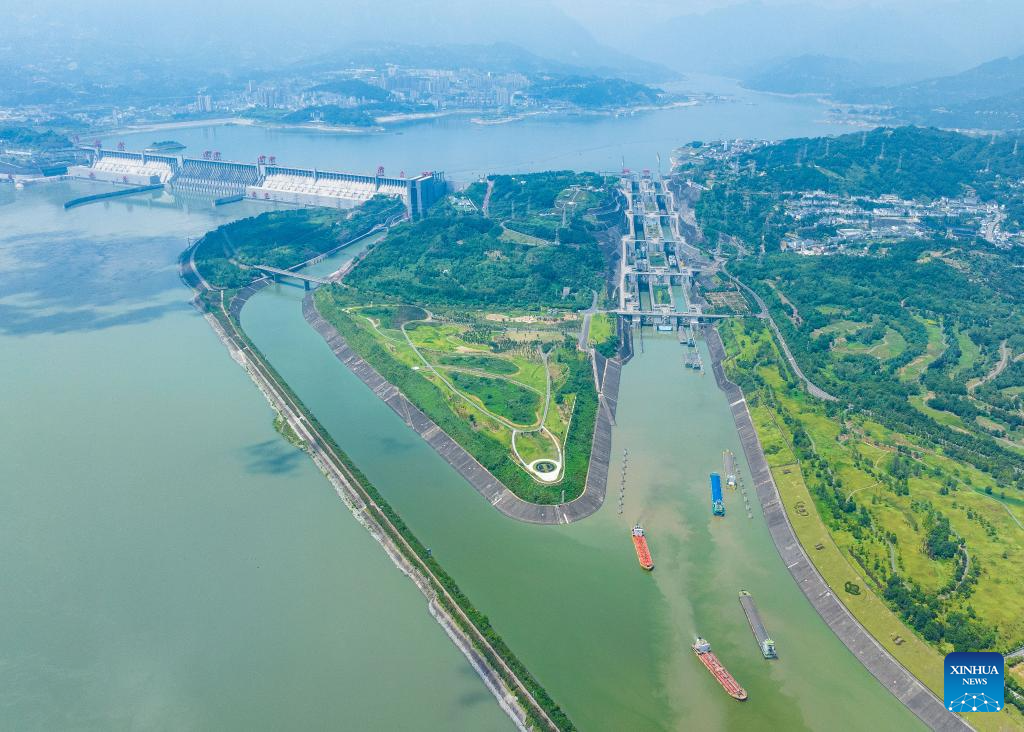 This aerial photo taken on Aug. 23, 2023 shows ships passing through the five-tier ship locks of the Three Gorges Dam in Yichang, central China's Hubei Province. The monthly cargo throughput via the five-tier ship locks at the Three Gorges Dam, the world's largest hydropower project in the upper stream of the Yangtze, reached a record high of over 15.71 million tonnes in August, according to the China Three Gorges Corporation. (Photo by Zheng Jiayu/Xinhua)