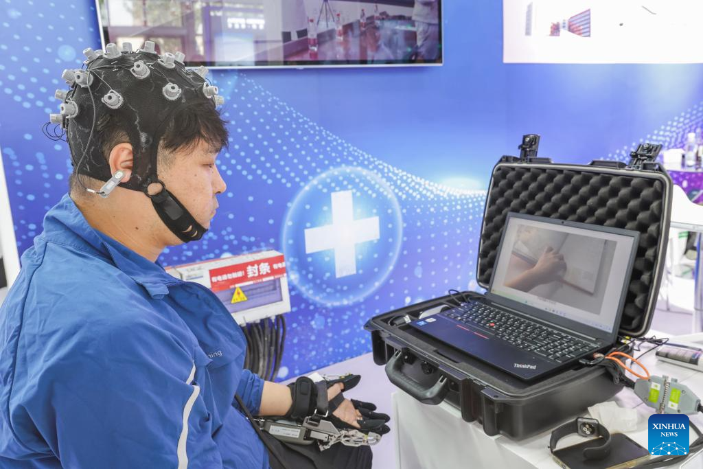 A visitor is tested with a rehabilitation system at the booth of Beijing Tsinghua Changgung Hospital at the exhibition area of healthcare services of the 2023 China International Fair for Trade in Services (CIFTIS) at Shougang Park in Beijing, capital of China, Sept. 4, 2023. (Xinhua/Zhang Yuwei)