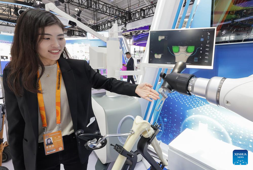 A staff member presents a robot used in the knee joint surgery at the booth of Peking Union Medical College Hospital at the exhibition area of healthcare services of the 2023 China International Fair for Trade in Services (CIFTIS) at Shougang Park in Beijing, capital of China, Sept. 4, 2023. (Xinhua/Zhang Yuwei)