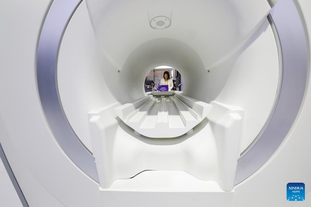 A staff member works at the booth of GE HealthCare at the exhibition area of healthcare services of the 2023 China International Fair for Trade in Services (CIFTIS) at Shougang Park in Beijing, capital of China, Sept. 4, 2023. (Xinhua/Zhang Yuwei)