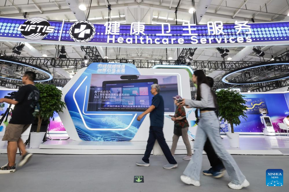 Visitors walk past the exhibition area of healthcare services of the 2023 China International Fair for Trade in Services (CIFTIS) at Shougang Park in Beijing, capital of China, Sept. 4, 2023. (Xinhua/Zhang Yuwei)