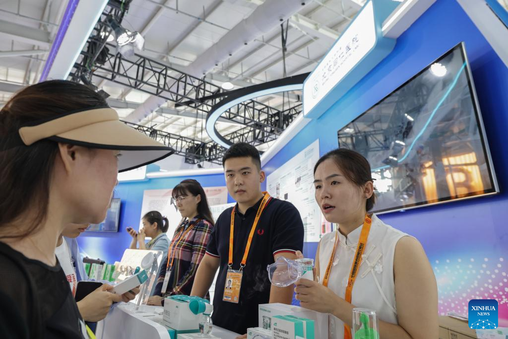 Staff members showcase a home use atomizer at the booth of Beijing Tongren Hospital at the exhibition area of healthcare services of the 2023 China International Fair for Trade in Services (CIFTIS) at Shougang Park in Beijing, capital of China, Sept. 4, 2023. (Xinhua/Zhang Yuwei)