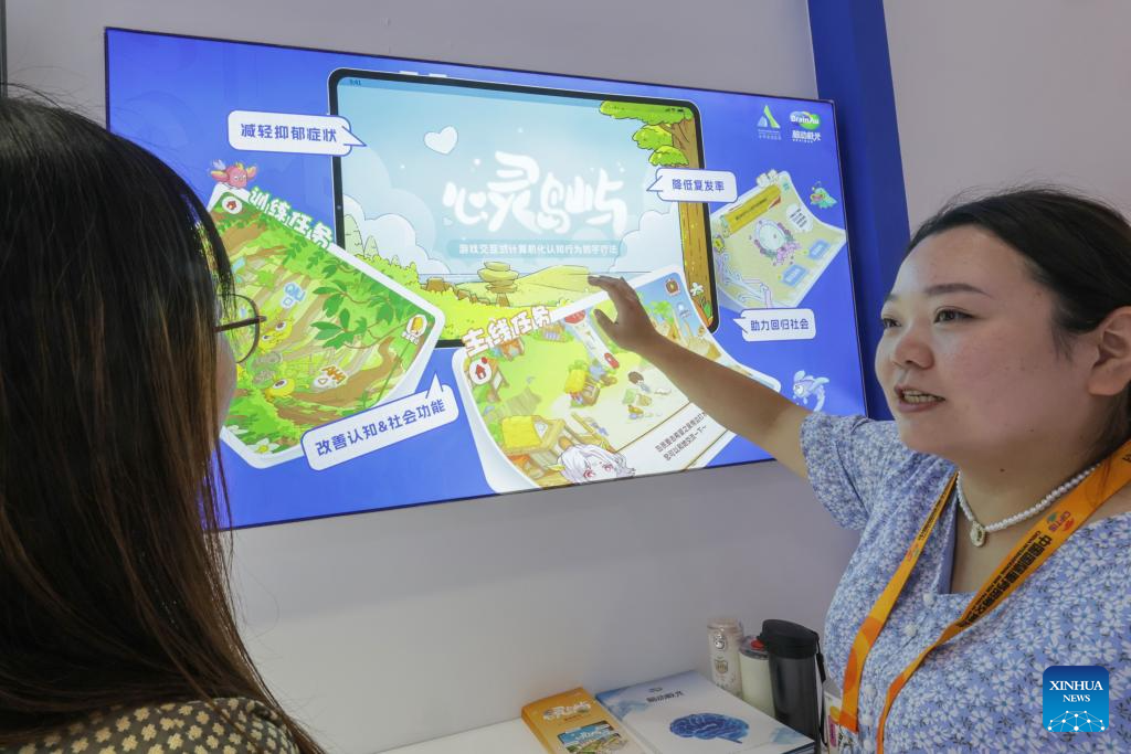 A staff member presents an AI-based system used in the treatment of depression at the booth of Beijing Anding Hospital at the exhibition area of healthcare services of the 2023 China International Fair for Trade in Services (CIFTIS) at Shougang Park in Beijing, capital of China, Sept. 4, 2023. (Xinhua/Zhang Yuwei)