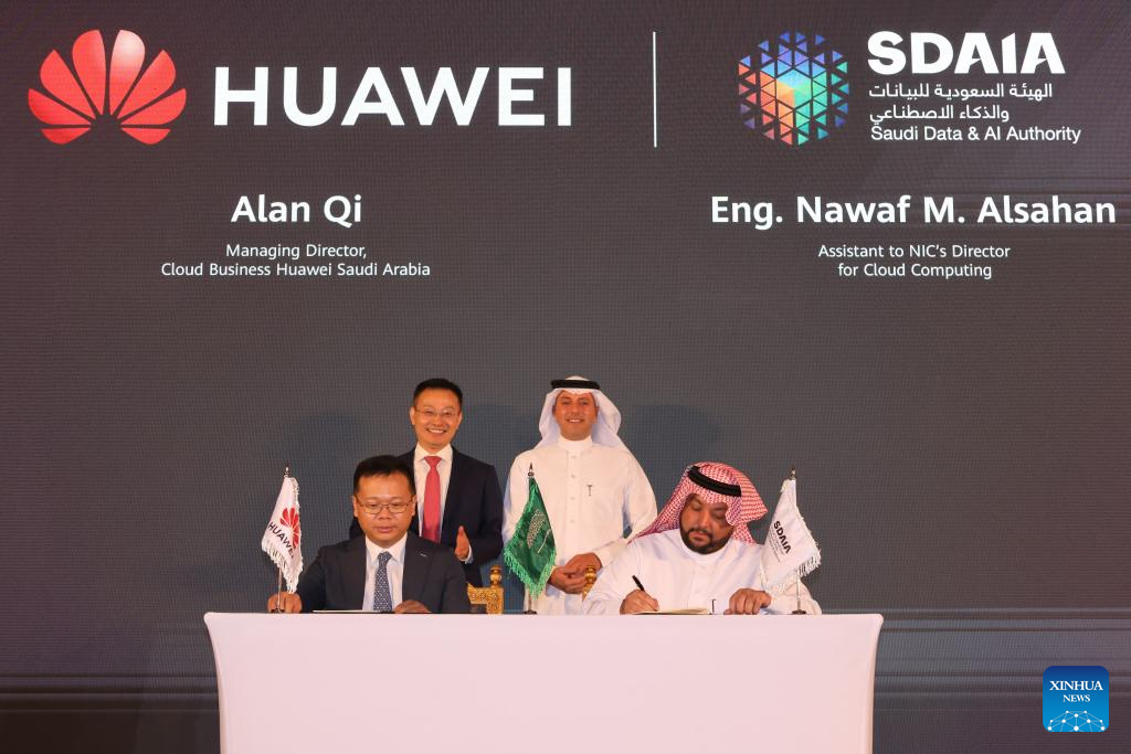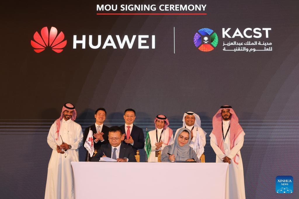Representatives from Huawei and a Saudi company sign MoUs during the Huawei Cloud Summit Saudi Arabia 2023 in Riyadh, Saudi Arabia, on Sept. 4, 2023. The Chinese tech giant Huawei announced on Monday the opening of a cloud data center in Riyadh, as part of its efforts to expand its online service offerings in the Middle East. (Xinhua/Wang Haizhou)