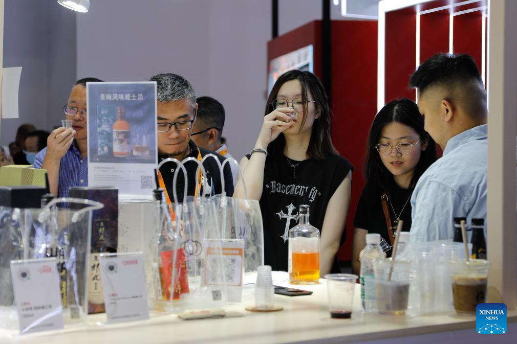 Visitors taste whisky at the booth of Japan during the 2023 China International Fair for Trade in Services (CIFTIS) at China National Convention Center in Beijing, capital of China, Sept. 4, 2023. Themed "Opening-up leads development, cooperation delivers the future," the 2023 CIFTIS is held in Beijing from Sept. 2 to 6. (Xinhua/Liu Mengqi)
