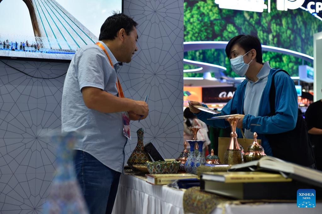 People visit the booth of Iran during the 2023 China International Fair for Trade in Services (CIFTIS) at China National Convention Center in Beijing, capital of China, Sept. 4, 2023. Themed "Opening-up leads development, cooperation delivers the future," the 2023 CIFTIS is held in Beijing from Sept. 2 to 6. (Xinhua/Liu Lingyi)