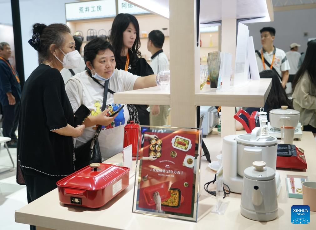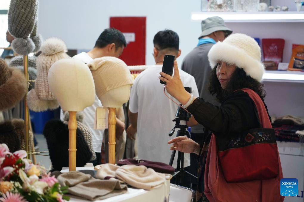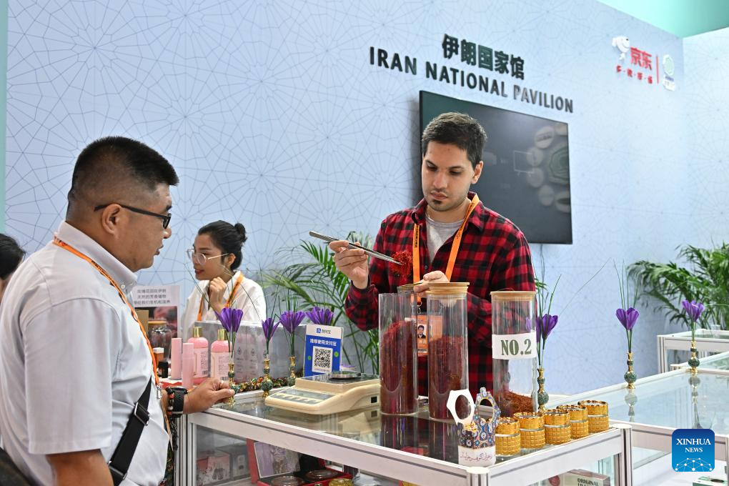 A visitor shops at the booth of Iran during the 2023 China International Fair for Trade in Services (CIFTIS) at China National Convention Center in Beijing, capital of China, Sept. 4, 2023. Themed "Opening-up leads development, cooperation delivers the future," the 2023 CIFTIS is held in Beijing from Sept. 2 to 6. (Xinhua/Li Xin)