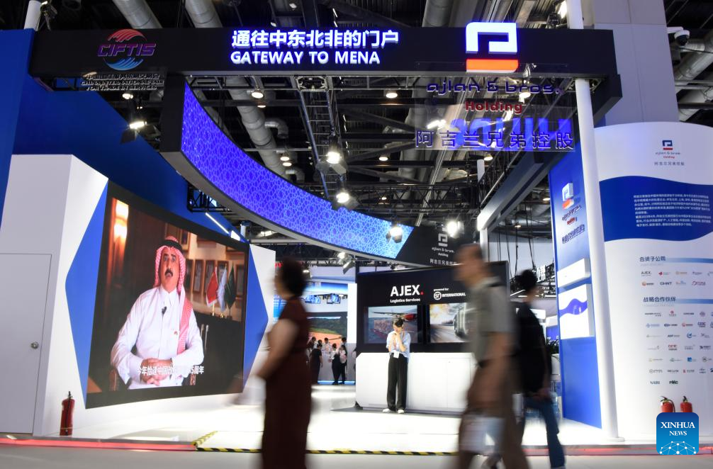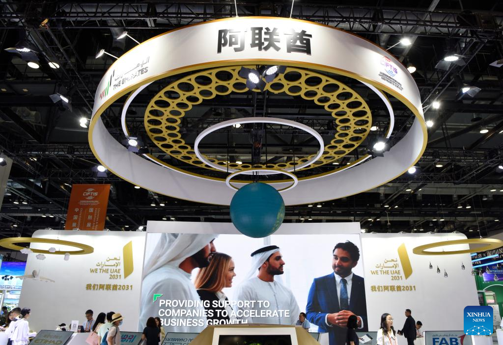 People visit the booth of the United Arab Emirates during the 2023 China International Fair for Trade in Services (CIFTIS) at China National Convention Center in Beijing, capital of China, Sept. 4, 2023. Themed "Opening-up leads development, cooperation delivers the future," the 2023 CIFTIS is held in Beijing from Sept. 2 to 6. (Xinhua/Wu Wei)