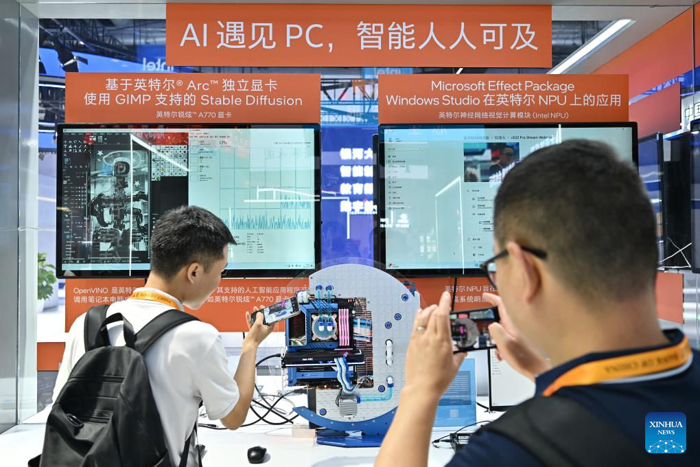 Visitors take pictures at the booth of Intel during the 2023 China International Fair for Trade in Services (CIFTIS) at China National Convention Center in Beijing, capital of China, Sept. 4, 2023. Themed "Opening-up leads development, cooperation delivers the future," the 2023 CIFTIS is held in Beijing from Sept. 2 to 6. (Xinhua/Li Xin)