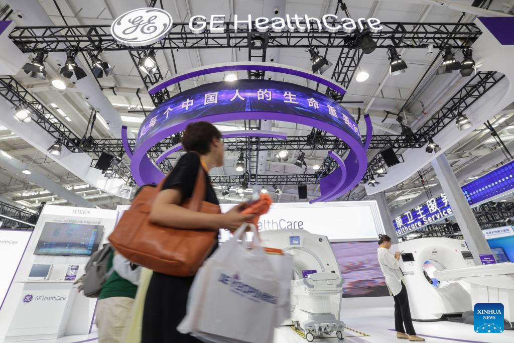 Visitors walk past the booth of GE HealthCare during the 2023 China International Fair for Trade in Services (CIFTIS) at Shougang Park in Beijing, capital of China, Sept. 4, 2023. Themed "Opening-up leads development, cooperation delivers the future," the 2023 CIFTIS is held in Beijing from Sept. 2 to 6. (Xinhua/Zhang Yuwei)