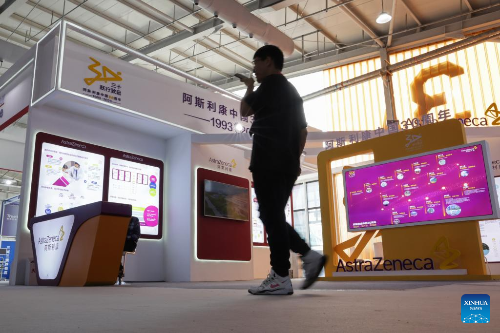 A visitor walks past the booth of AstraZeneca during the 2023 China International Fair for Trade in Services (CIFTIS) at Shougang Park in Beijing, capital of China, Sept. 4, 2023. Themed "Opening-up leads development, cooperation delivers the future," the 2023 CIFTIS is held in Beijing from Sept. 2 to 6. (Xinhua/Zhang Yuwei)