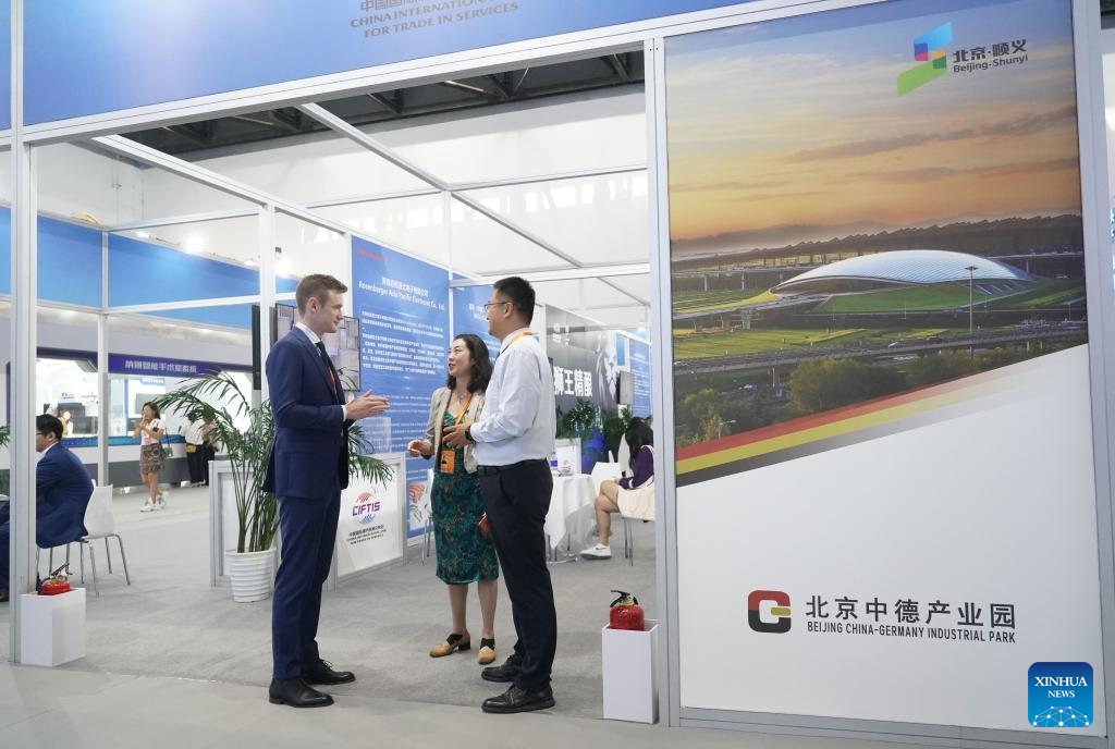 People visit the booth of the Beijing China-Germany Industrial Park during the 2023 China International Fair for Trade in Services (CIFTIS) at China National Convention Center in Beijing, capital of China, Sept. 4, 2023. Themed "Opening-up leads development, cooperation delivers the future," the 2023 CIFTIS is held in Beijing from Sept. 2 to 6. (Xinhua/Ren Chao)