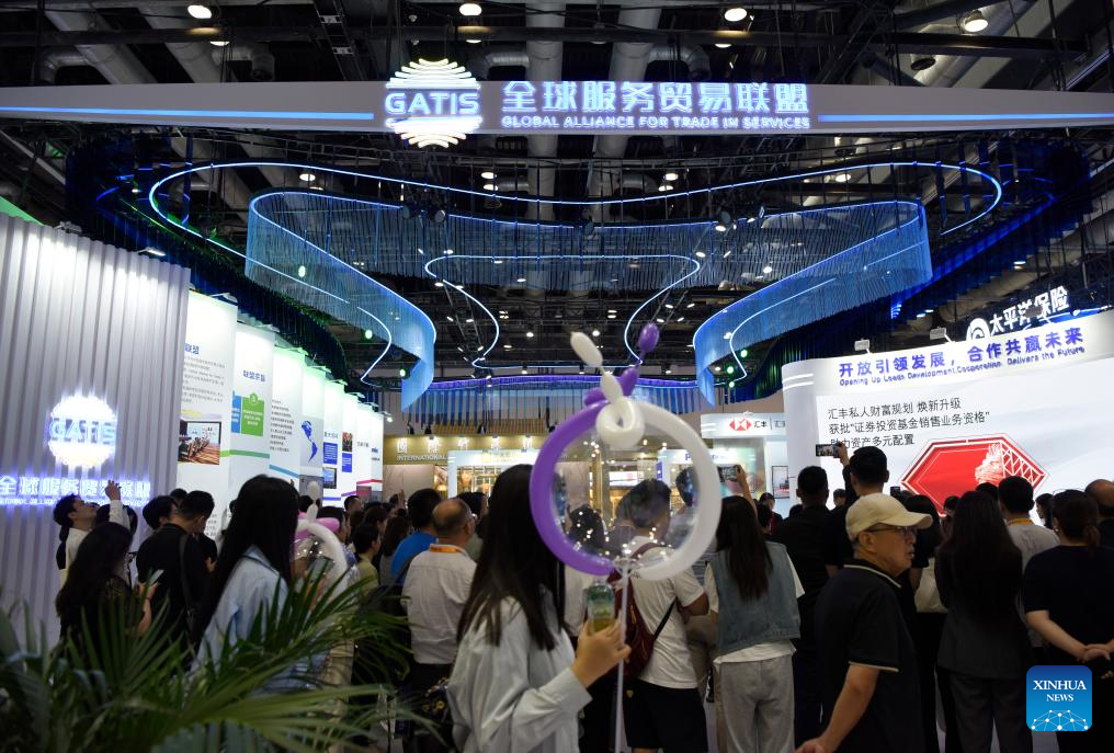People visit the booth of the Global Alliance for Trade in Services during the 2023 China International Fair for Trade in Services (CIFTIS) at China National Convention Center in Beijing, capital of China, Sept. 4, 2023. Themed "Opening-up leads development, cooperation delivers the future," the 2023 CIFTIS is held in Beijing from Sept. 2 to 6. (Xinhua/Wu Wei)