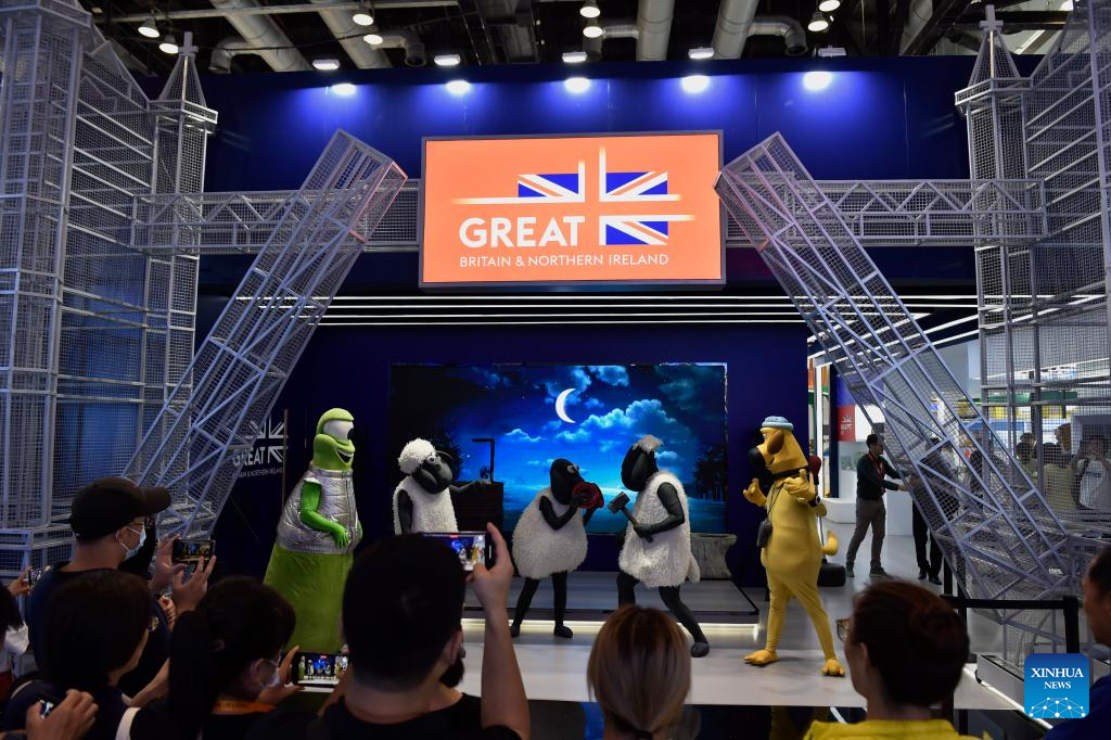 Visitors watch a show at the booth of Britain during the 2023 China International Fair for Trade in Services (CIFTIS) at China National Convention Center in Beijing, capital of China, Sept. 4, 2023. Britain is the guest country of honor of the 2023 CIFTIS. Themed "Opening-up leads development, cooperation delivers the future," the 2023 CIFTIS is held in Beijing from Sept. 2 to 6. (Xinhua/Liu Lingyi)