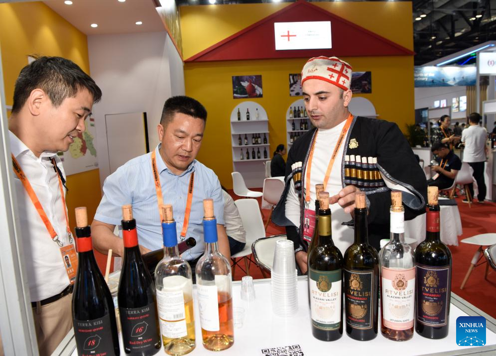 People taste wine at the booth of Georgia during the 2023 China International Fair for Trade in Services (CIFTIS) at China National Convention Center in Beijing, capital of China, Sept. 4, 2023. Themed "Opening-up leads development, cooperation delivers the future," the 2023 CIFTIS is held in Beijing from Sept. 2 to 6. (Xinhua/Wu Wei)