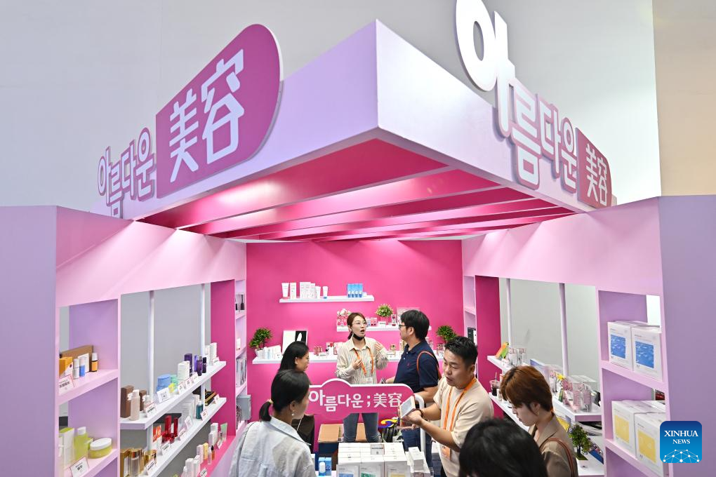 Visitors learn about beauty products at the booth of South Korea during the 2023 China International Fair for Trade in Services (CIFTIS) at China National Convention Center in Beijing, capital of China, Sept. 4, 2023. Themed "Opening-up leads development, cooperation delivers the future," the 2023 CIFTIS is held in Beijing from Sept. 2 to 6. (Xinhua/Li Xin)
