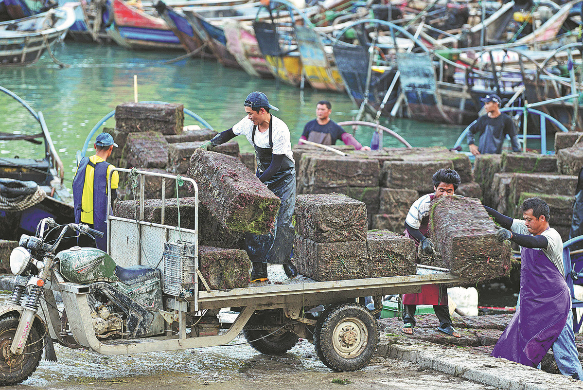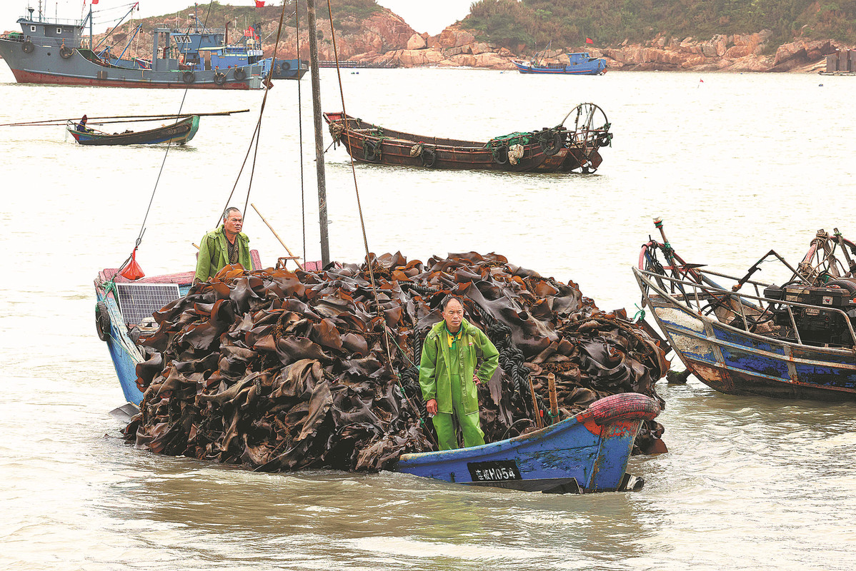 A boat fully loaded with kelp returns to Dinghai Bay in Lianjiang on April 22 from an offshore aquaculture farm. WANG WANGWANG/FOR CHINA DAILY
