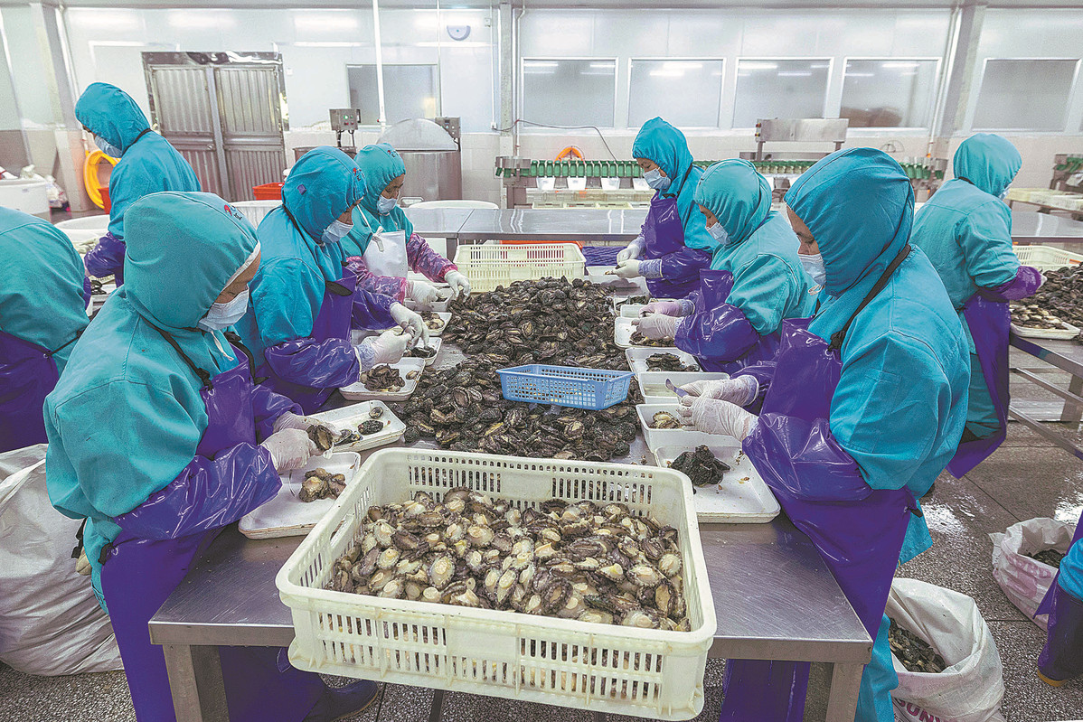 Workers sort abalones at a processing factory in Putian, Fujian, on April 9. CHEN BIN/FOR CHINA DAILY