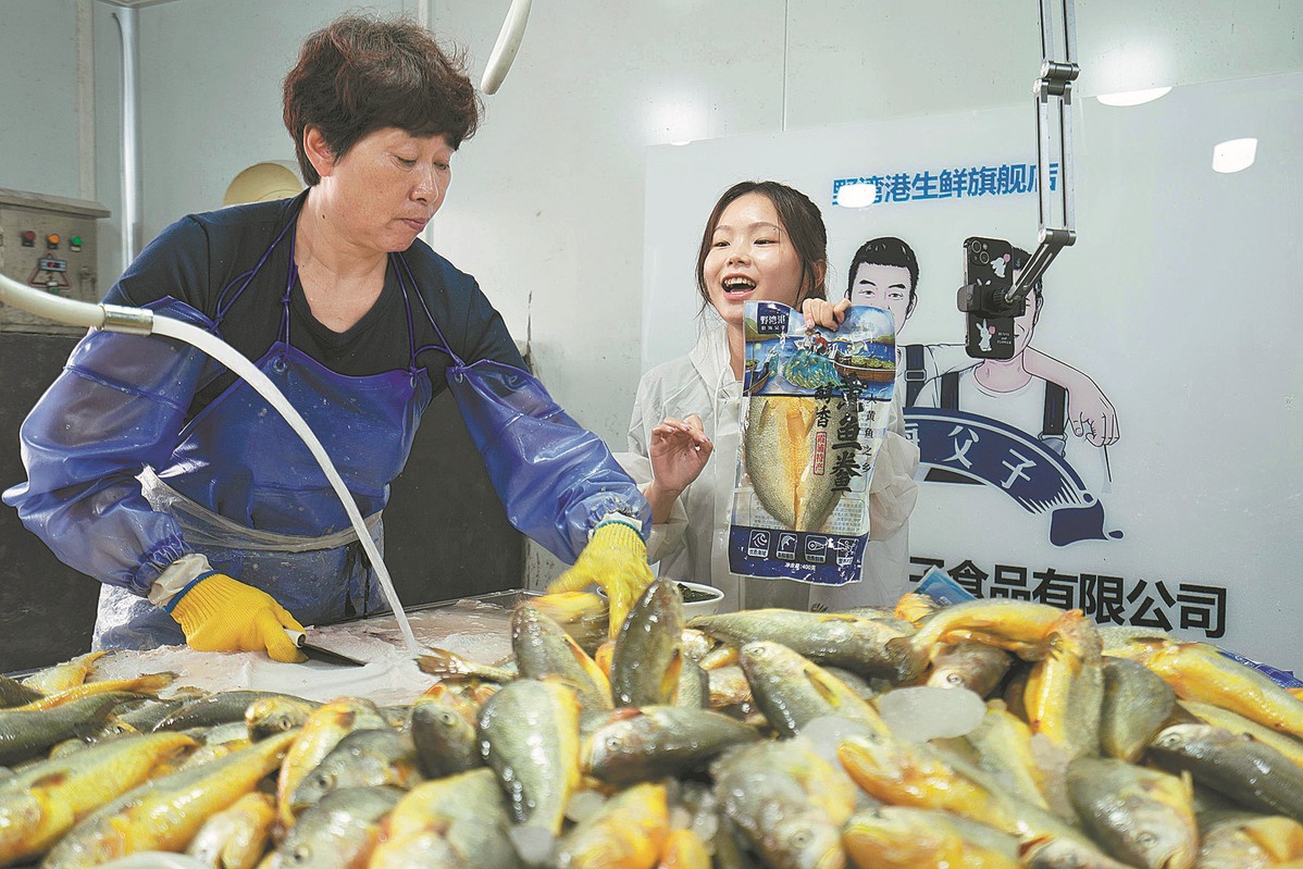 A livestreamer sells dried large yellow croaker online at a processing factory in Xiapu county, Ningde, on April 18. WANG YI/FOR CHINA DAILY