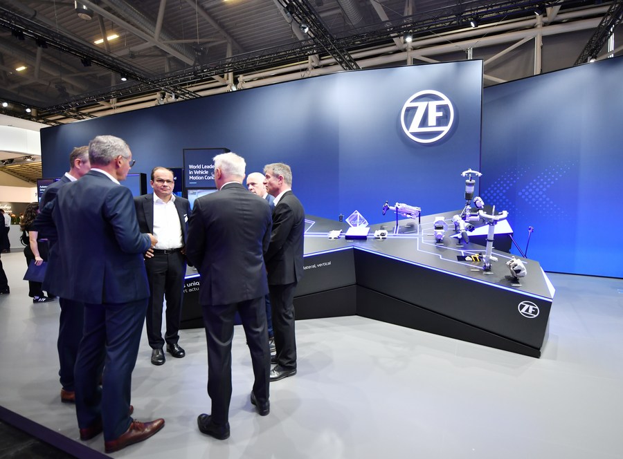 People talk at the booth of ZF Group during the press preview of the 2023 International Motor Show (IAA) in Munich, Germany, Sept. 4, 2023. (Xinhua/Ren Pengfei)
