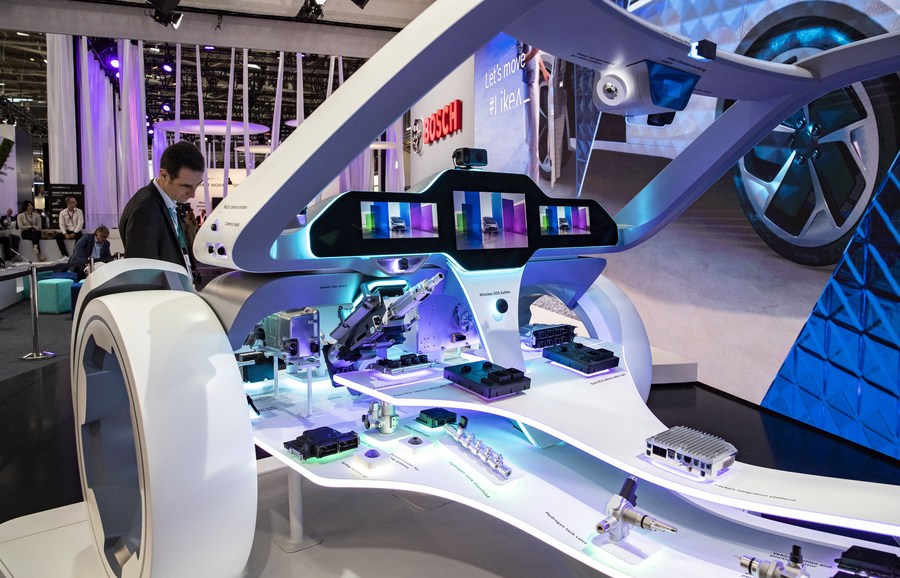 This photo taken on Sept. 4, 2023 shows the booth of Bosch during the press preview of the 2023 International Motor Show (IAA) in Munich, Germany. (Xinhua/Zhang Fan)