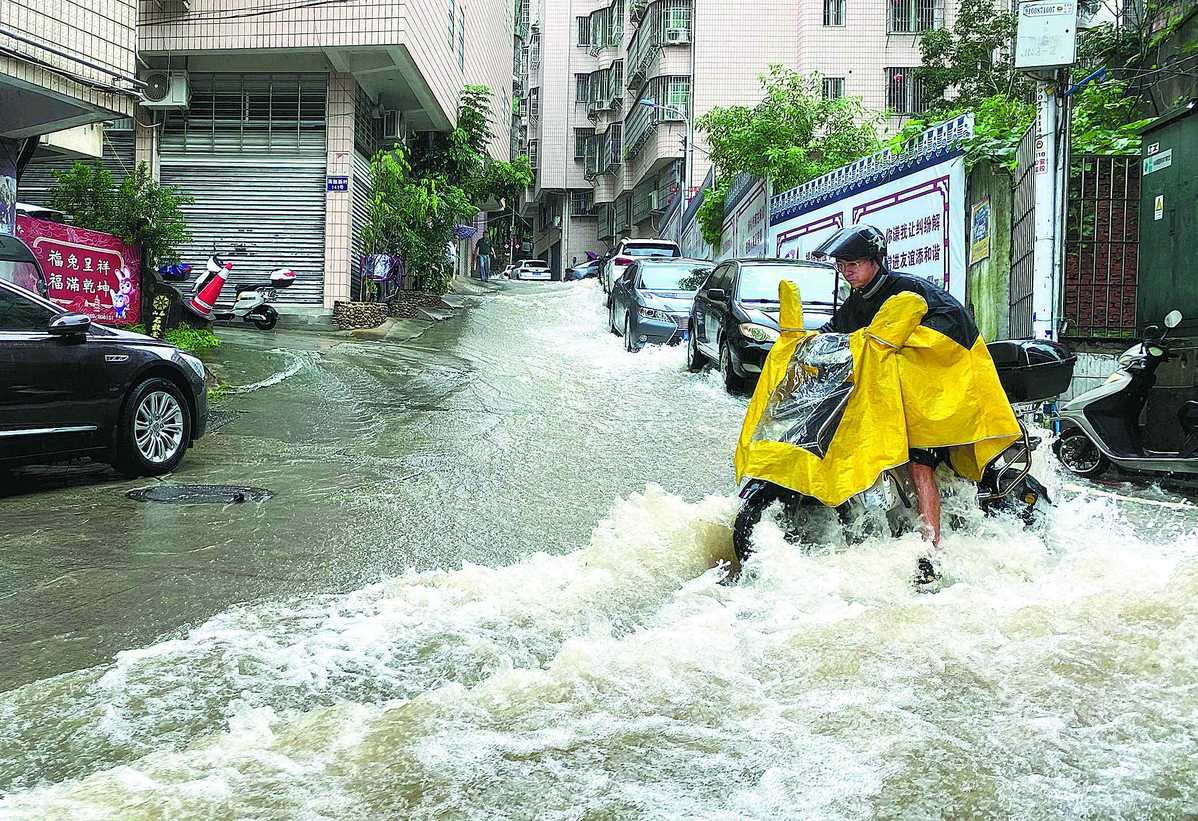 A resident rides through a flooded street in a community in Ningde, Fujian province, on Tuesday. Many parts of the city center were flooded due to the heavy rainfall induced by Typhoon Haikui. YE MAO/CHINA NEWS SERVICE