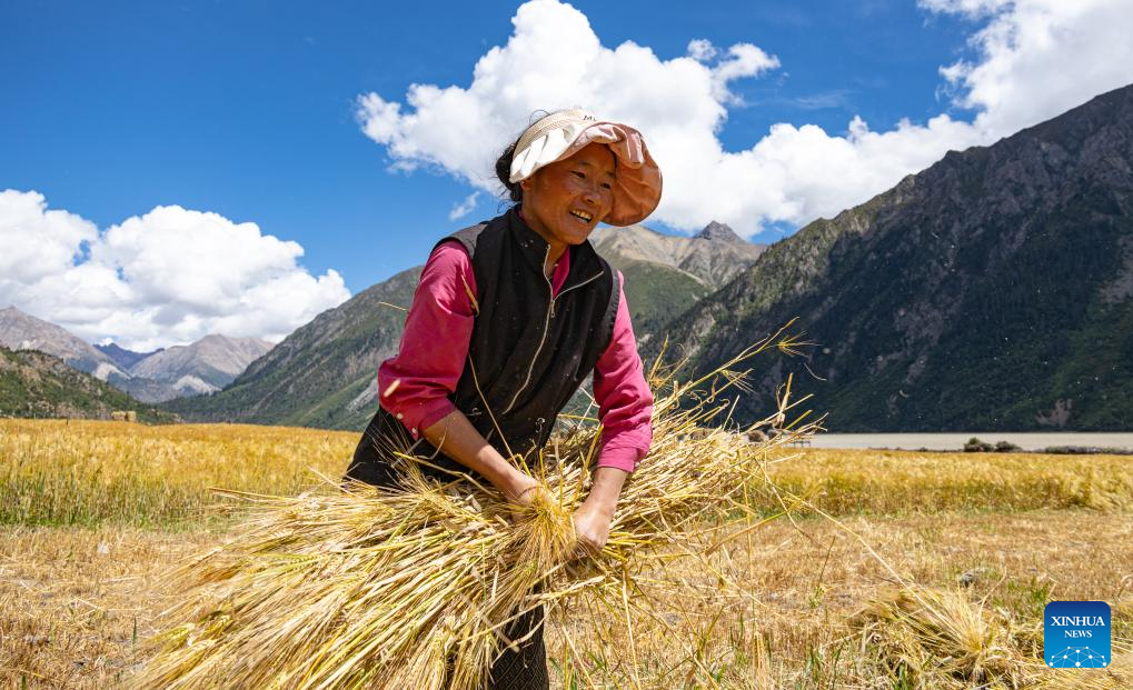 A villager bundles highland barley in Waba Village of Ra'og Town of Qamdo City, southwest China's Tibet Autonomous Region, Sept. 4, 2023. (Photo by Tenzin Nyida/Xinhua)