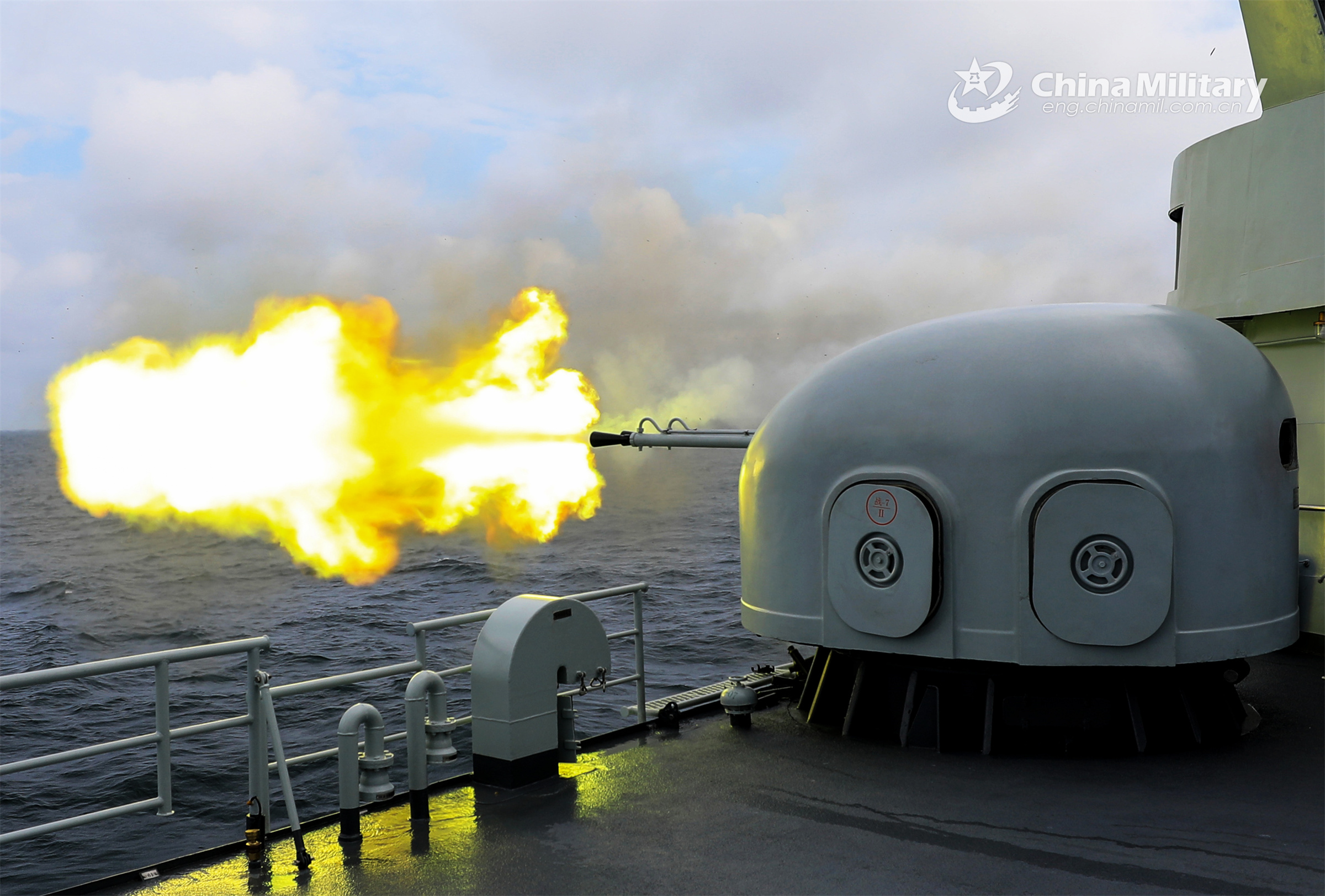 The guided-missile frigate Jiaxing attached to a frigate flotilla with the navy under the PLA Eastern Theater Command fires its rocket-propelled depth charges at mock sea targets during a real-combat training exercise in August. (eng.chinamil.com.cn/Photo by Ren Wei)