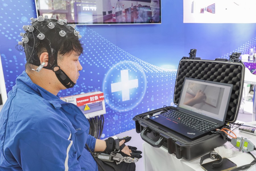 A visitor is tested with a rehabilitation system at the booth of Beijing Tsinghua Changgung Hospital at the exhibition area of healthcare services of the 2023 China International Fair for Trade in Services (CIFTIS) at Shougang Park in Beijing, capital of China, Sept. 4, 2023. (Xinhua/Zhang Yuwei)