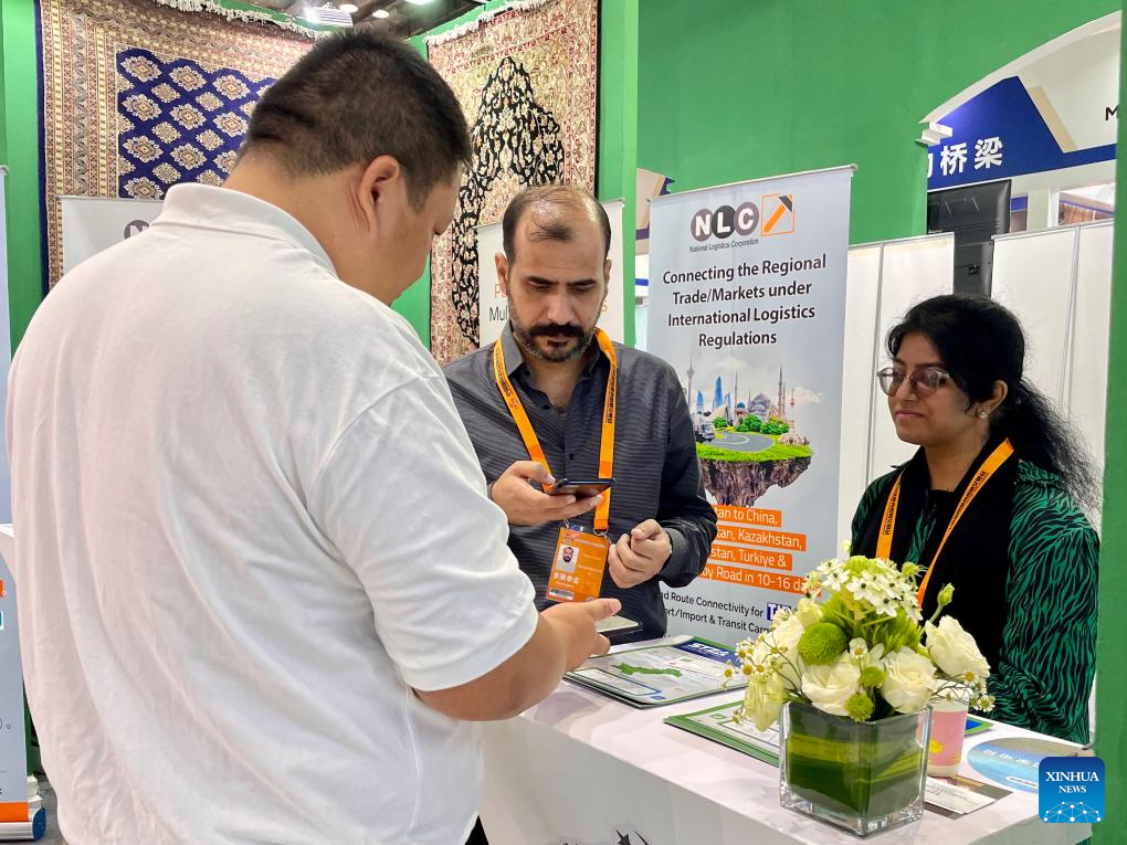 Hussain Azhar (C) interacts with a visitor at the Pakistani national pavilion on the 2023 China International Fair for Trade in Services (CIFTIS) in Beijing, Sept 3, 2023. [Photo/Xinhua]