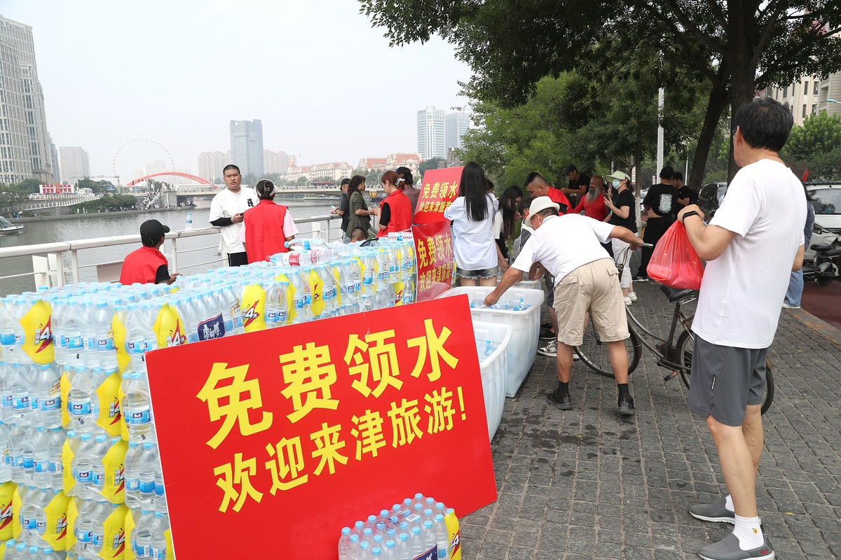 A site is set for visitors to take bottled water for free near the Shizilin Bridge in Tianjin on Sept 5, 2023. [Photo by Zou Hong/chinadaily.com.cn]