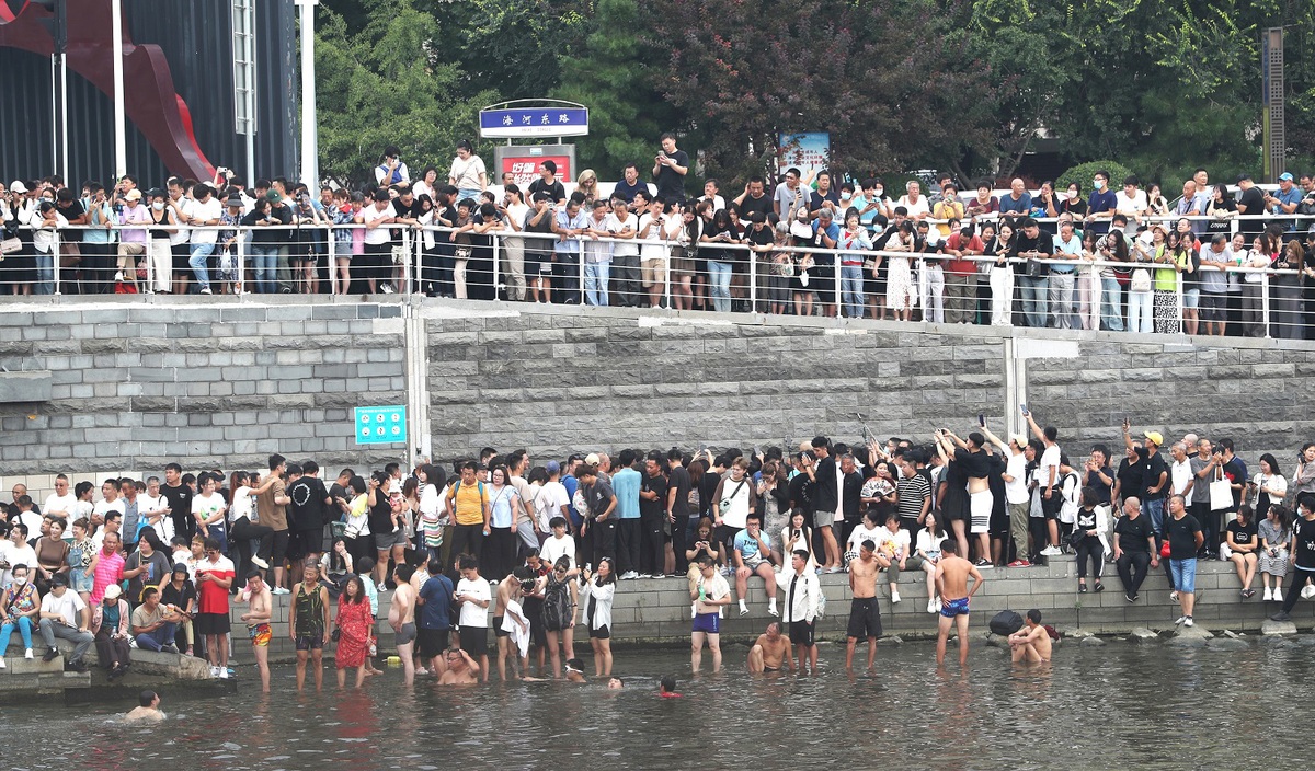 People gather around the Shizilin Bridge to watch "diving performance" in Tianjin on Sept 5, 2023. [Photo by Zou Hong/chinadaily.com.cn]