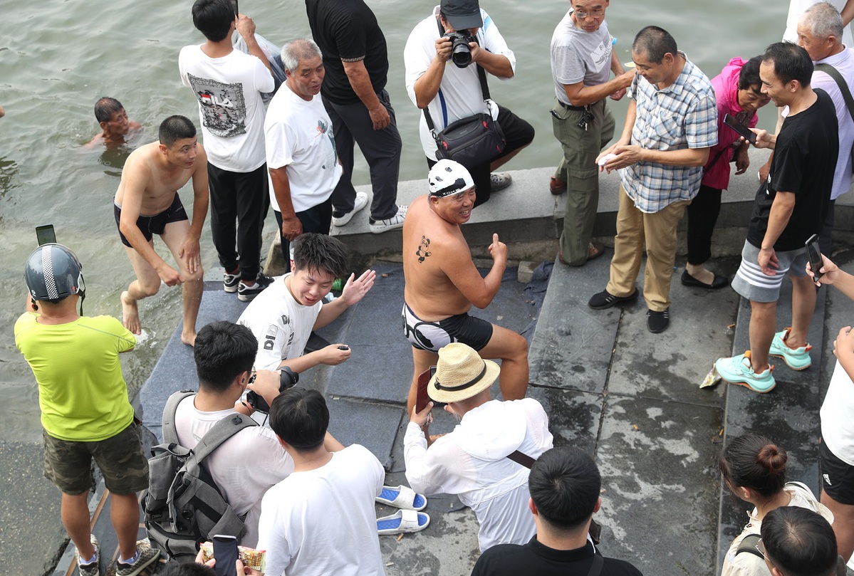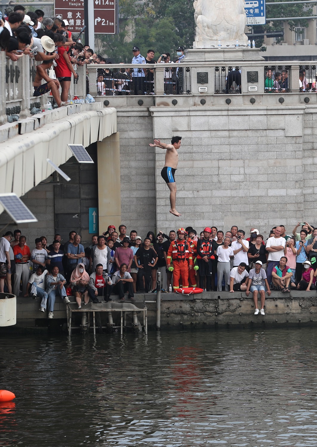 Visitors watch as an elderly resident dives into the Haihe River from the Shizilin Bridge in Tianjin on Sept 5, 2023. An intrepid group of elderly individuals in northern China's Tianjin has recently sparked both curiosity and concern with their unique approach to the sport of diving. [Photo by Zou Hong/chinadaily.com.cn]