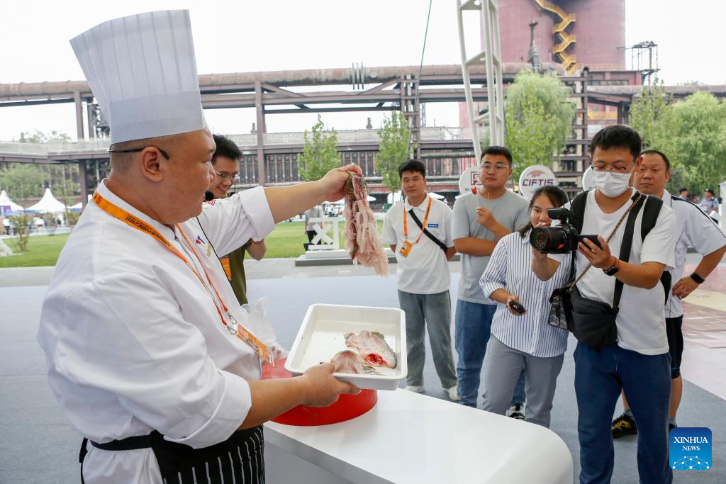 A chef demonstrates knife-handling skills at the exhibition hall of Beijing time-honored brand during the 2023 China International Fair for Trade in Services (CIFTIS) in Beijing, capital of China, Sept. 2, 2023. A number of time-honored brands in catering business made their debut at the exhibition hall of Beijing time-honored brand during the 2023 CIFTIS, attracting numerous guests to come for a taste. (Xinhua/Chen Shuo)