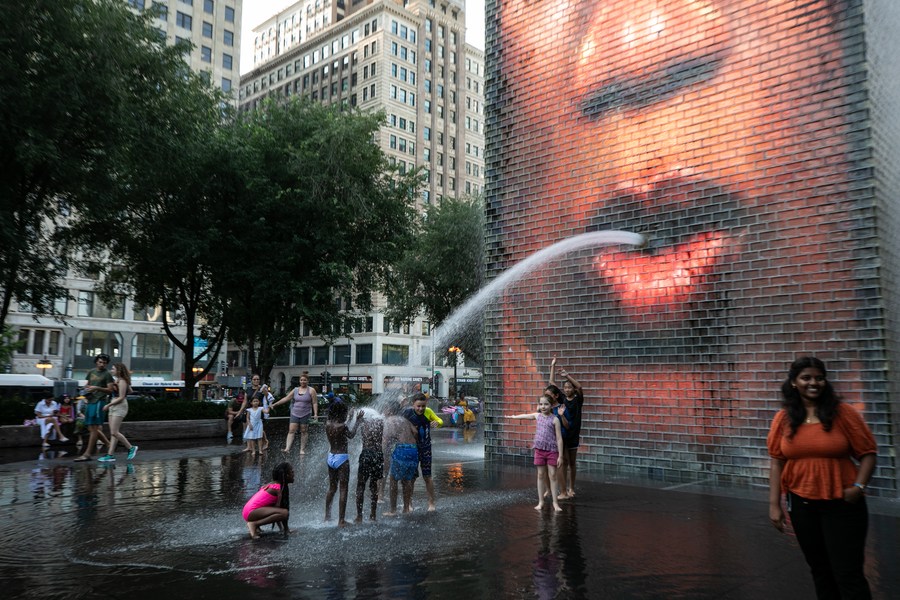 Children cool down at Crown Fountain in downtown Chicago, the United States, on Aug. 23, 2023. (Photo by Vincent D. Johnson/Xinhua)
