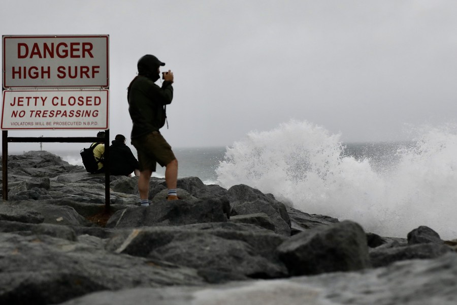 A person takes photos of huge waves at Newport Beach, California, the United States, Aug. 20, 2023. (Xinhua)
