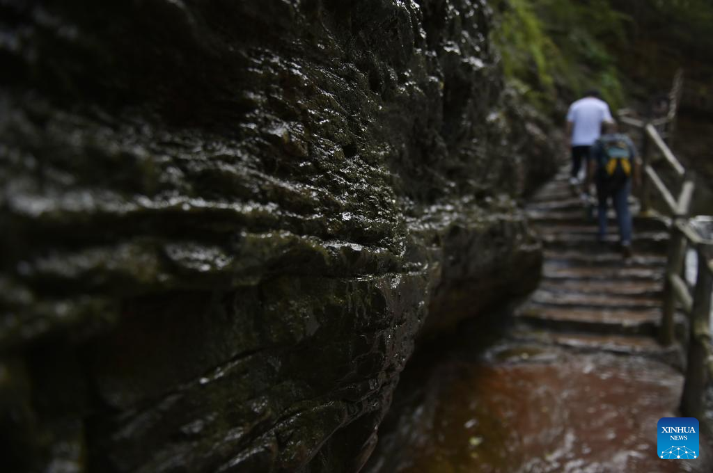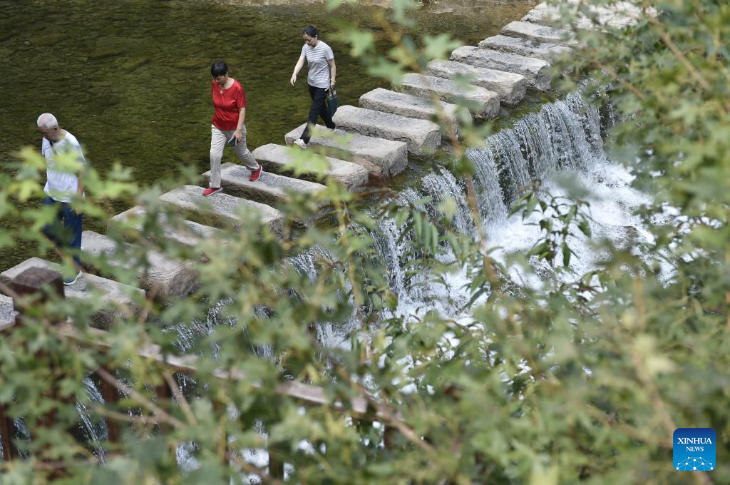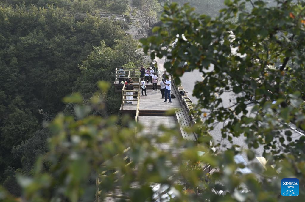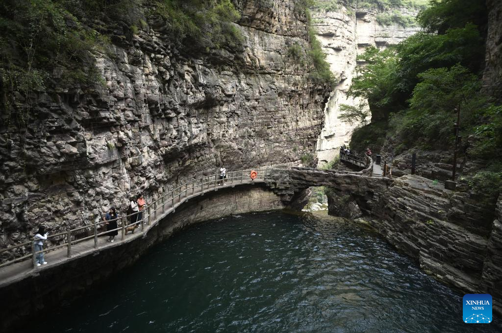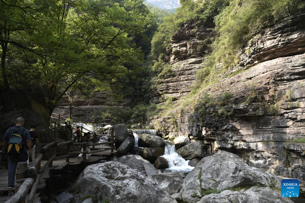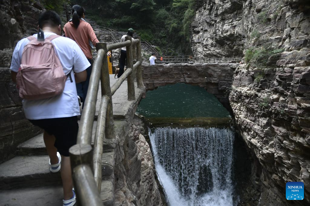 Tourists visit the Taihang Grand Canyon in Linzhou City, central China's Henan Province, Sept. 6, 2023. The Taihang Grand Canyon scenic spot, covering a total area of about 89 square kilometers, features lucid waters and lush mountains. (Xinhua/Lu Peng)