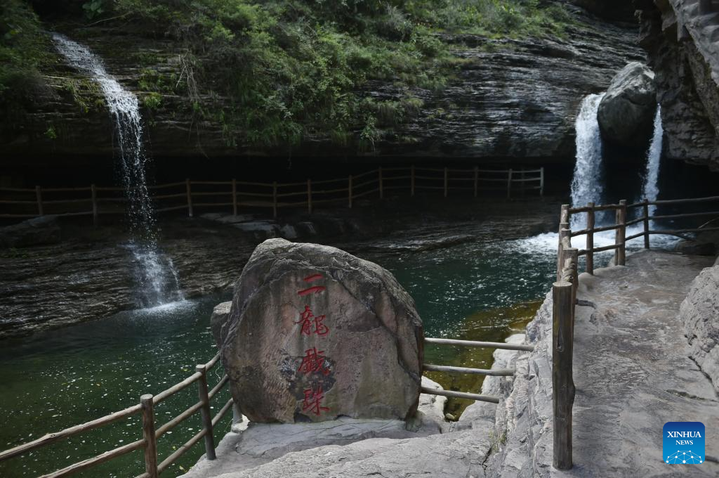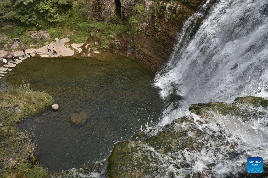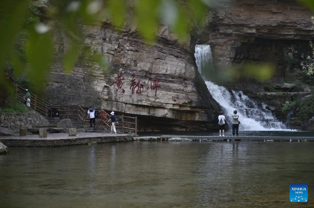 Tourists visit a waterfall at the Taihang Grand Canyon in Linzhou City, central China's Henan Province, Sept. 6, 2023. The Taihang Grand Canyon scenic spot, covering a total area of about 89 square kilometers, features lucid waters and lush mountains. (Xinhua/Lu Peng)