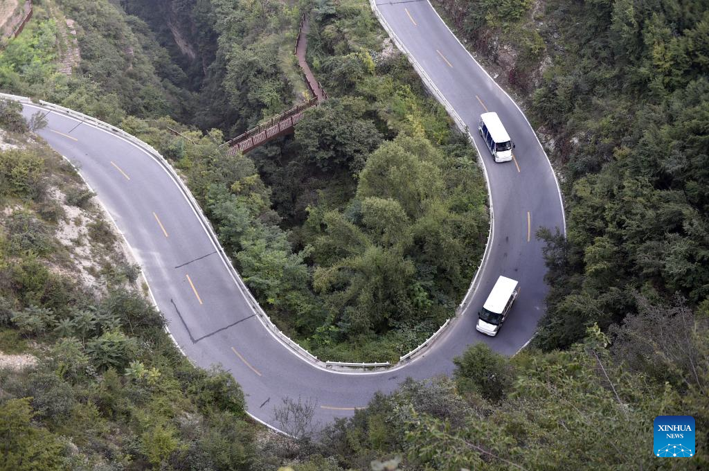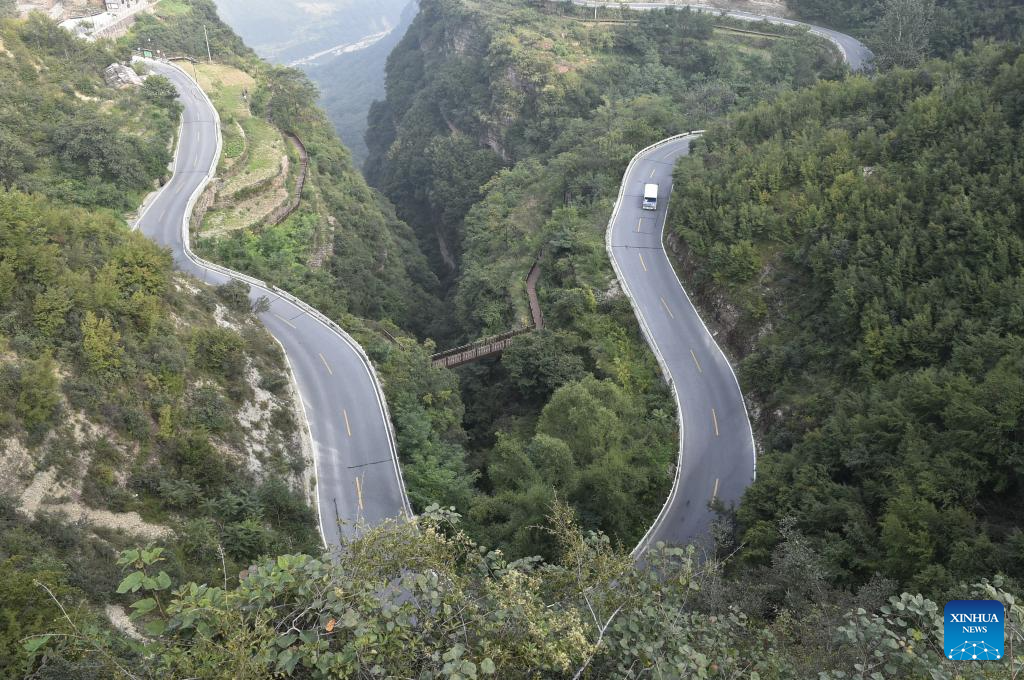 This photo taken on Sept. 6, 2023 shows a view of a winding road at the Taihang Grand Canyon in Linzhou City, central China's Henan Province. The Taihang Grand Canyon scenic spot, covering a total area of about 89 square kilometers, features lucid waters and lush mountains. (Xinhua/Lu Peng)