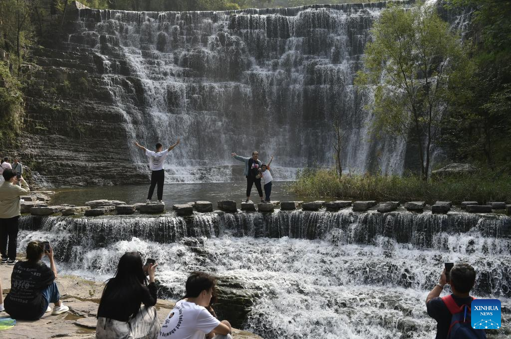 Tourists pose for photos in front of a waterfall at the Taihang Grand Canyon in Linzhou City, central China's Henan Province, Sept. 6, 2023. The Taihang Grand Canyon scenic spot, covering a total area of about 89 square kilometers, features lucid waters and lush mountains. (Xinhua/Lu Peng)