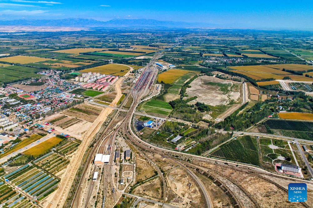 This aerial photo taken on Sept. 6, 2023 shows the standard-gauge rail yard of Horgos station in Horgos, northwest China's Xinjiang Uygur Autonomous Region. The number of China-Europe (Central Asia) freight trains passing Horgos Port in northwest China's Xinjiang Uygur Autonomous Region has reached 5,156 by the end of August this year, 11.6 percent higher than that of the same period a year earlier, according to statistics released by the local railway authority. (Xinhua/Zhao Ge)