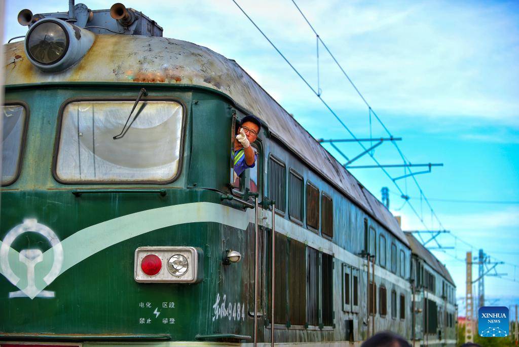 A driver gets prepared to start the train at Horgos station in Horgos, northwest China's Xinjiang Uygur Autonomous Region, on Sept. 6, 2023. The number of China-Europe (Central Asia) freight trains passing Horgos Port in northwest China's Xinjiang Uygur Autonomous Region has reached 5,156 by the end of August this year, 11.6 percent higher than that of the same period a year earlier, according to statistics released by the local railway authority. (Xinhua/Zhao Ge)